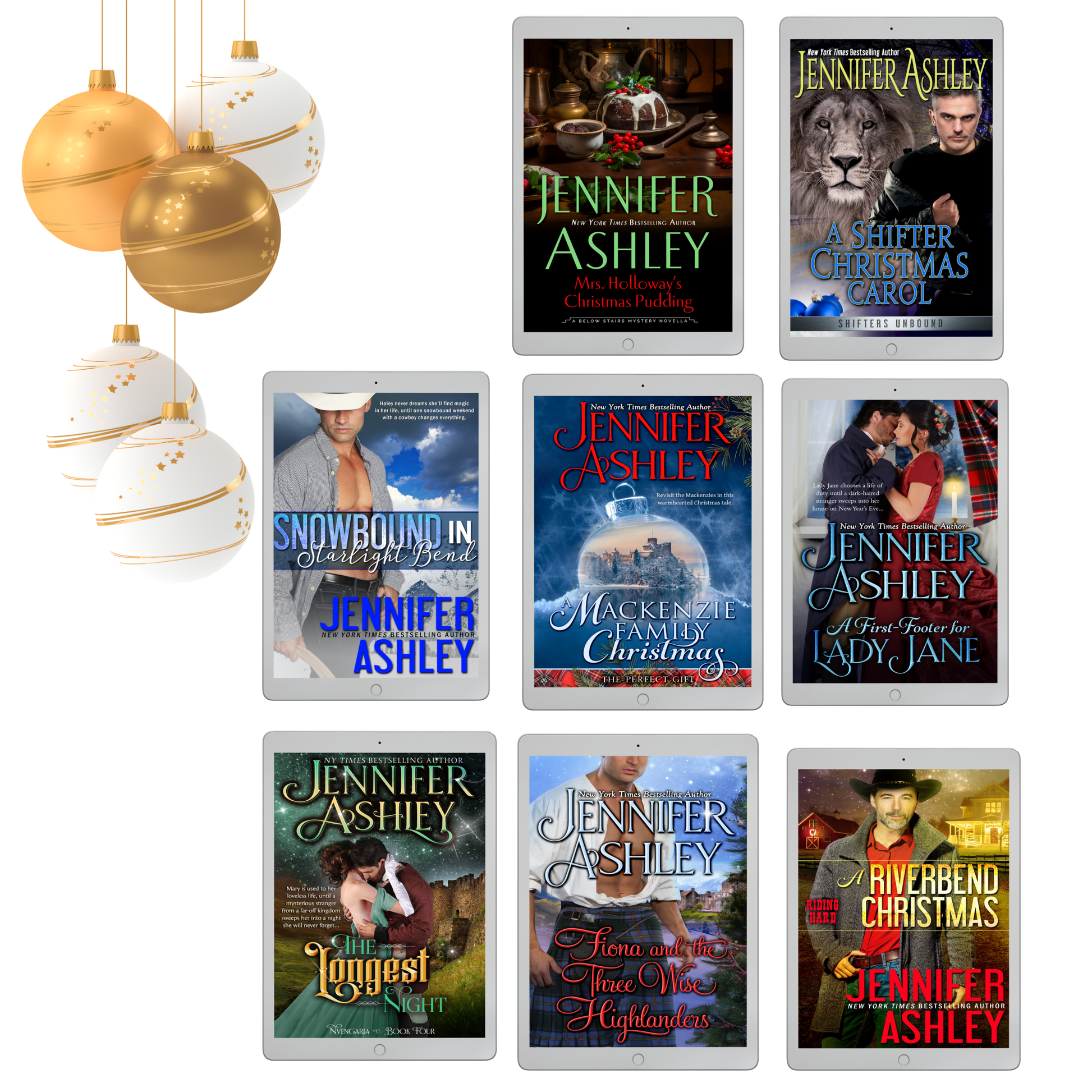 A collection of Winter Holiday stories by Jennifer Ashley across all series.
